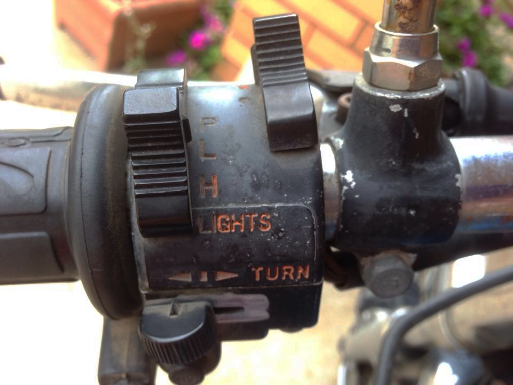 The left side switch gear was similar to that used in 1973 - as in 1973, the turn signal switch actuator has a half round head, and is secured from the underside to the switch plate by a screw. The markings on the switch gear are changed from 1973 in that the arrows showing left and right for the turn signals now had word 'TURN' marked beside them. As well 'HORN' was spelled out and the 'HI' and 'LO' high low dipping switch for the headlamp now was marked as being 'Lights'