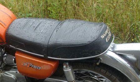 The seat pans and foam are fully interchangeable 1974 through 1977, and the addition of a keyed seat lock incorporating a helmet lock which was new for 1974 also carried through to the end of production. The seat covers used from 1974 through to 1977 all had the same oval stamped (not stitched) pattern as seen to the right, but the 1974 model was the only one having 'Suzuki GT' silk screened on the back of the seat rather than just 'Suzuki'.
