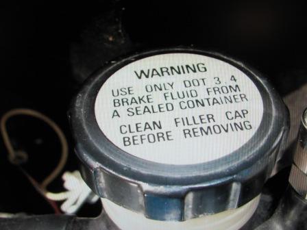 Early brake fluid reservoirs had a warning label that differed from later caps - an early version is seen immediately to the right and to the far right is the later style.