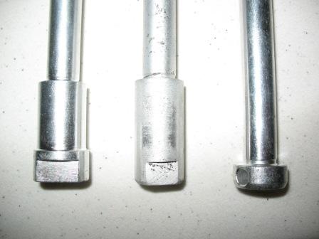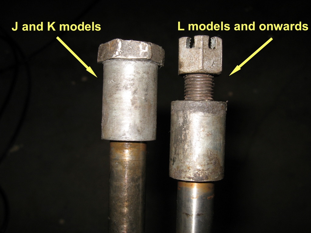 Referring to the photo below left, the front axle was now the single shouldered style as seen at the right side, and was 249 mm in length only for the 1974 model year, changing to 235 mm for 1975 through to the end of production. The removable nut was as seen in the photo to the lower right. On the left are the J and K model nuts and on the right that used for the L and later models.