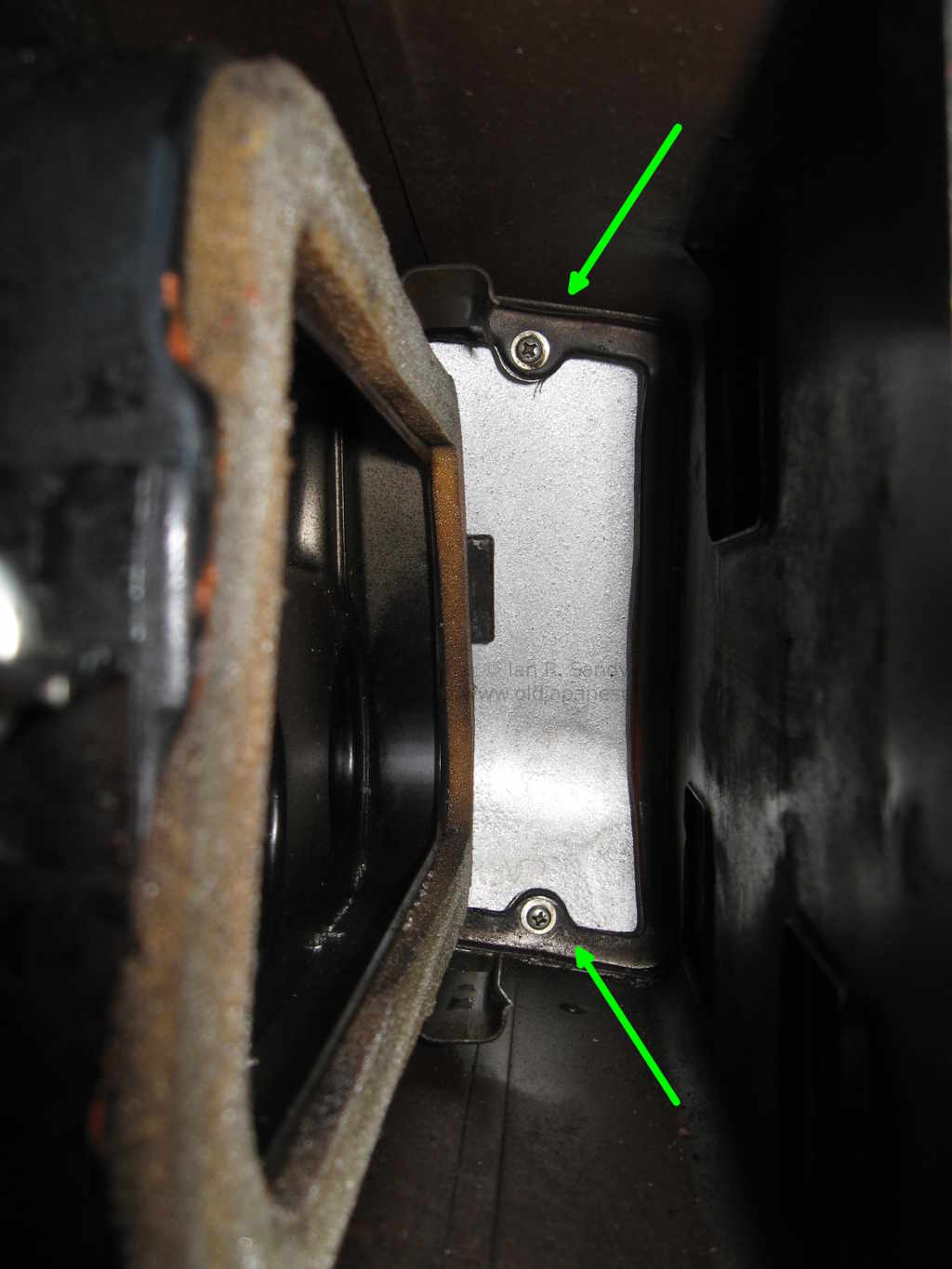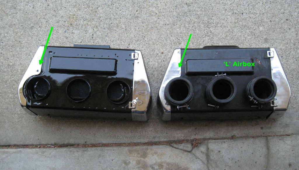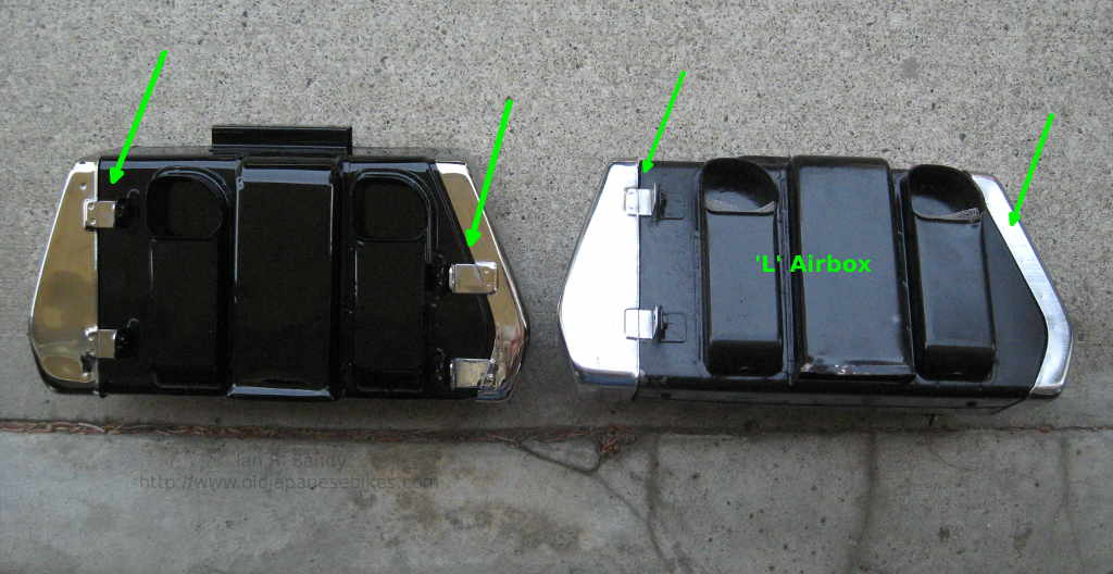 The air box (13700-31211)and air box side covers are specific to the 1974 model year, although the air filter element was the same as was used through to the end of the 1977 production. The photo to the upper right shows differences on the carb side, middle right shows the rear (note the 'L' left cover tabs are shorter than later versions) and lower right shows the two internal locating screws inside the 'L' airbox to secure the right side chromed cover.