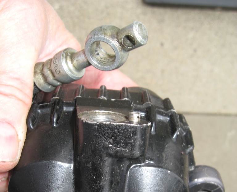 1974 marked a switch to all rubber brake hoses, and on early model year production specifically a locator pin was used to position the banjo fitting on the calliper. Refer to the photo to the right. This design was revised and simplified later in the model year.