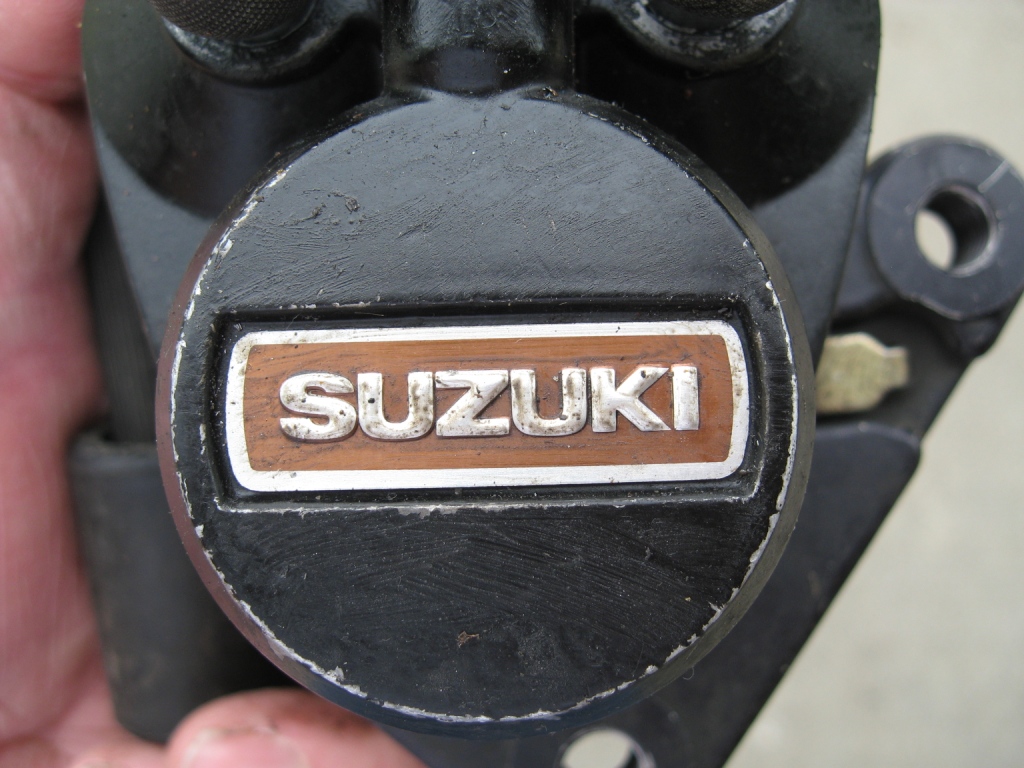 The small 'Suzuki' labels on the brake callipers often appear to be brown due to UV bleaching. They are actually aluminium plates and the word 'Suzuki' is done in raised, polished letters surrounded by black fill.