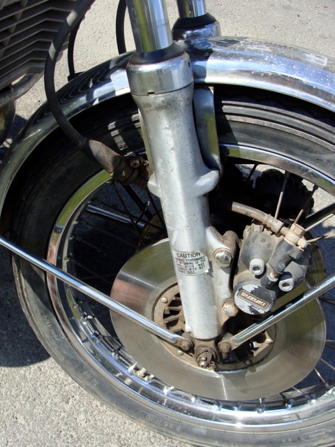 The front forks were specific to 1974 having chrome top caps on the lower fork legs covering the fork dust boot (photo lower right) -the fork gaiters of the 'J' and 'K' were dropped and the fork oil drain hole was moved to the rear of the lower fork leg. On the triple tree, the steering stem was new (51410-31700 – common for the L, M and A models) and having a new steering stem nut (51353-31700) replacing the bolt used in 1972 and 1973.