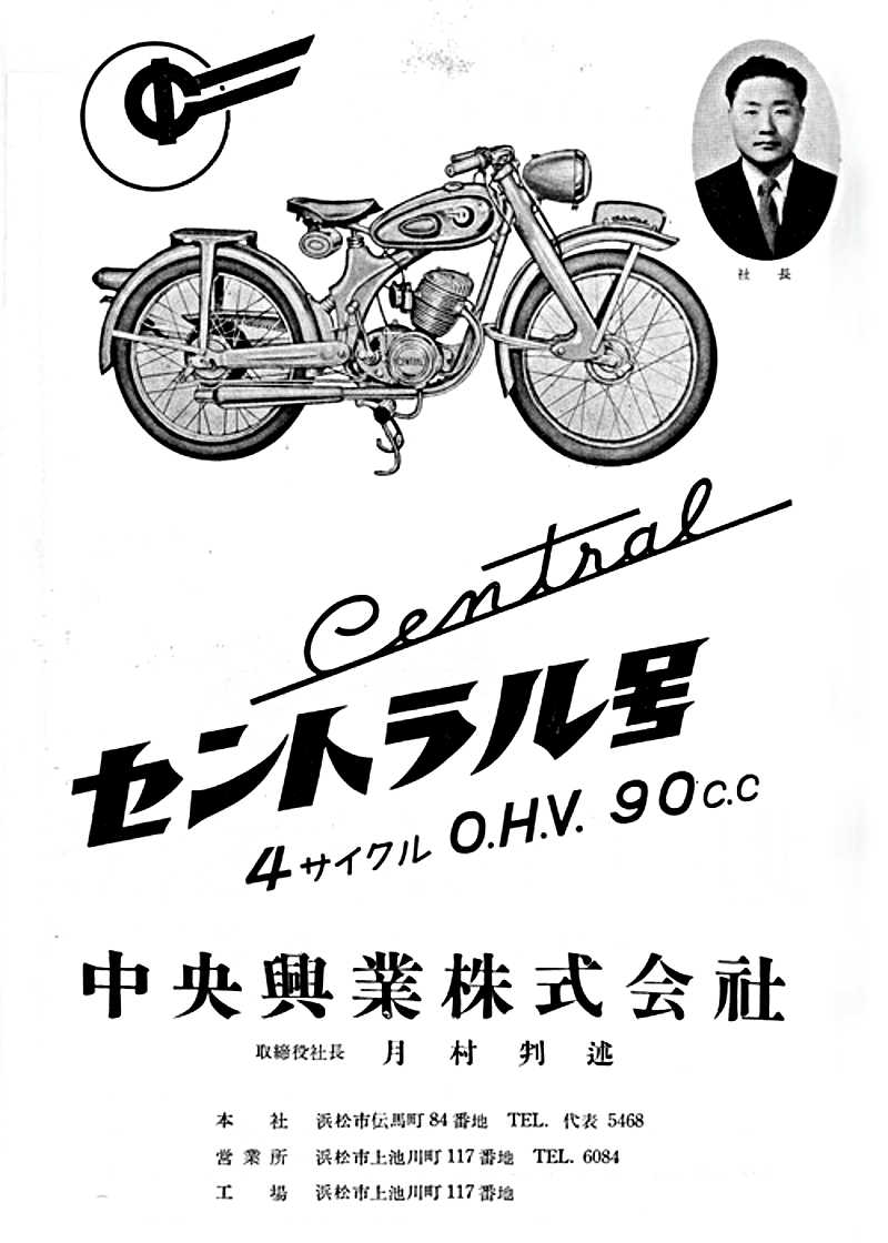 In 1954 Chuo Kogyo produced a 90cc single cylinder 4 stroke machine called the Central (セントラル号). The 'Century of Japanese Motorcycles' lists them as being a one year only company, however it appears they at least announced a 125cc model for 1955 called the Central King (セ ン ト ラ ル ・ キ ン グ号). Per the specifications sheet, the frame appears to be a rear mono-shock. They used someone elses engine, but at this time the make is unknown.