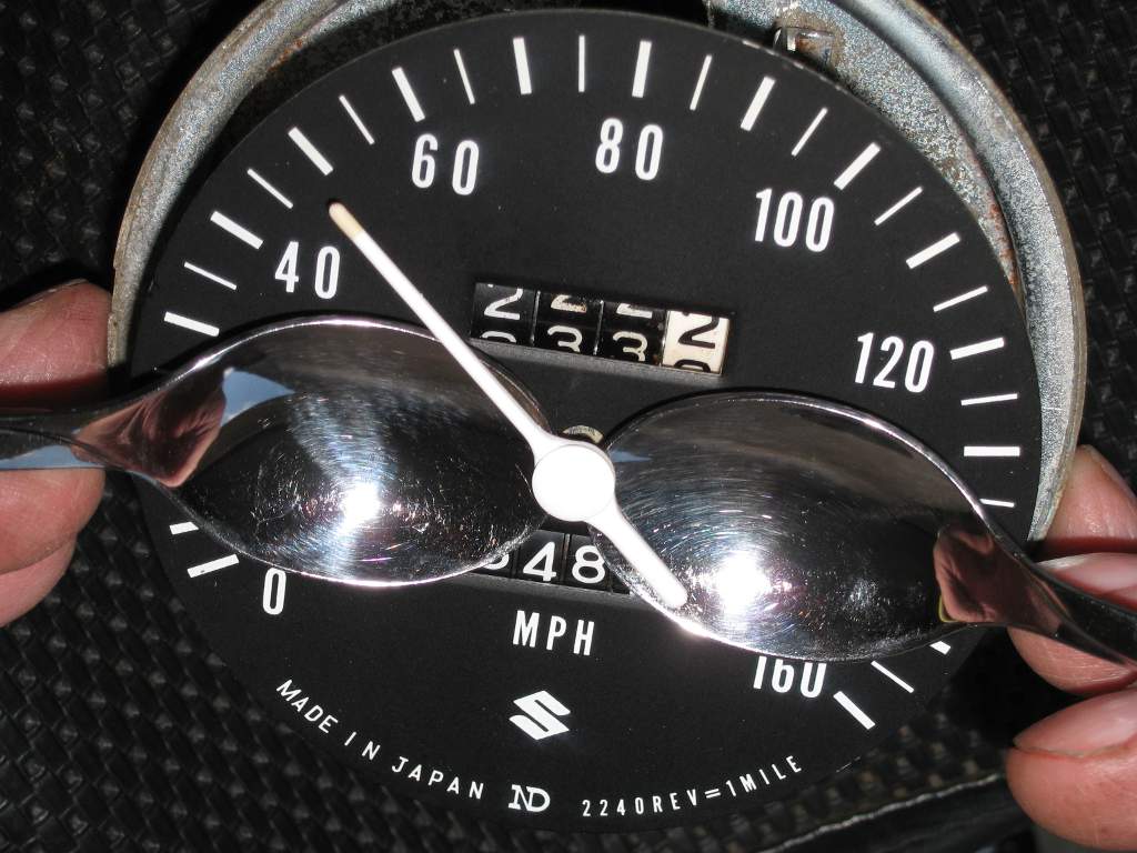 Now remove the indicator needle - I use the teaspoon method when my wife is not around. Just place the backs of two spoons on the heads of the two screws securing the gauge/clock face and then gently and evenly lever off the needle. The most important part of this is to first have placed a cloth over the face of the clock, otherwise your needle will now have disappeared into the neither regions of your work area, never to be found again (don't ask me how I know). The tip of the needle can be repainted with a day-glo orange hobby paint.