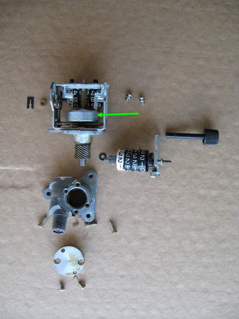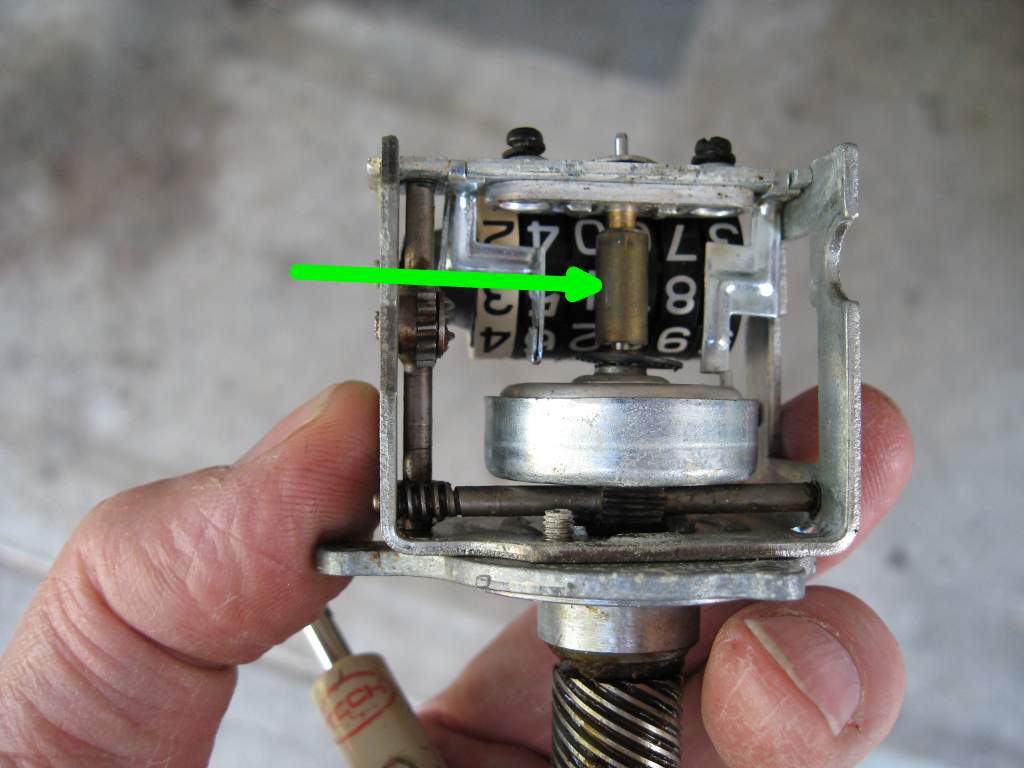 Below is a partially exploded view of the clock/gauge internals specific to the 1972J clocks (later gauges are different). The drive gear box in the lower part of the photos can be disassembled, cleaned and re-greased quite easily. The other components just normally need a very careful cleaning with a light solvent like WD40, and then a drop of light machine oil put on the drive gears. Only use a strong solvent like brake wash on unpainted surfaces as it will quickly wash all the digits off your odometer and trip meter reels if you are not really careful. Note that the 'bell' (indicated by the arrow) and the upper insert fitting into it should not touch each other - and do not add oil to the inside of the bell. Doing so will prevent your gauge from working at all.