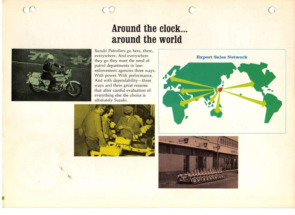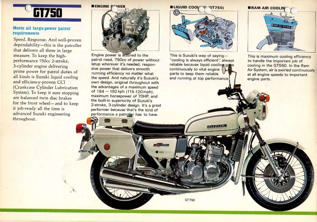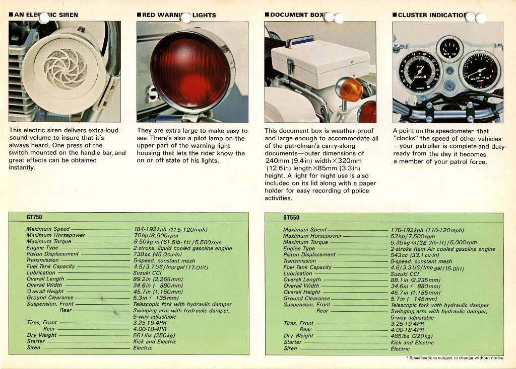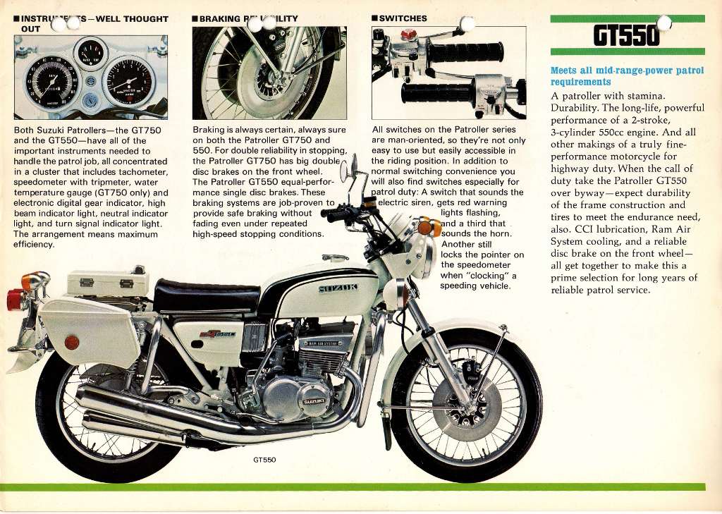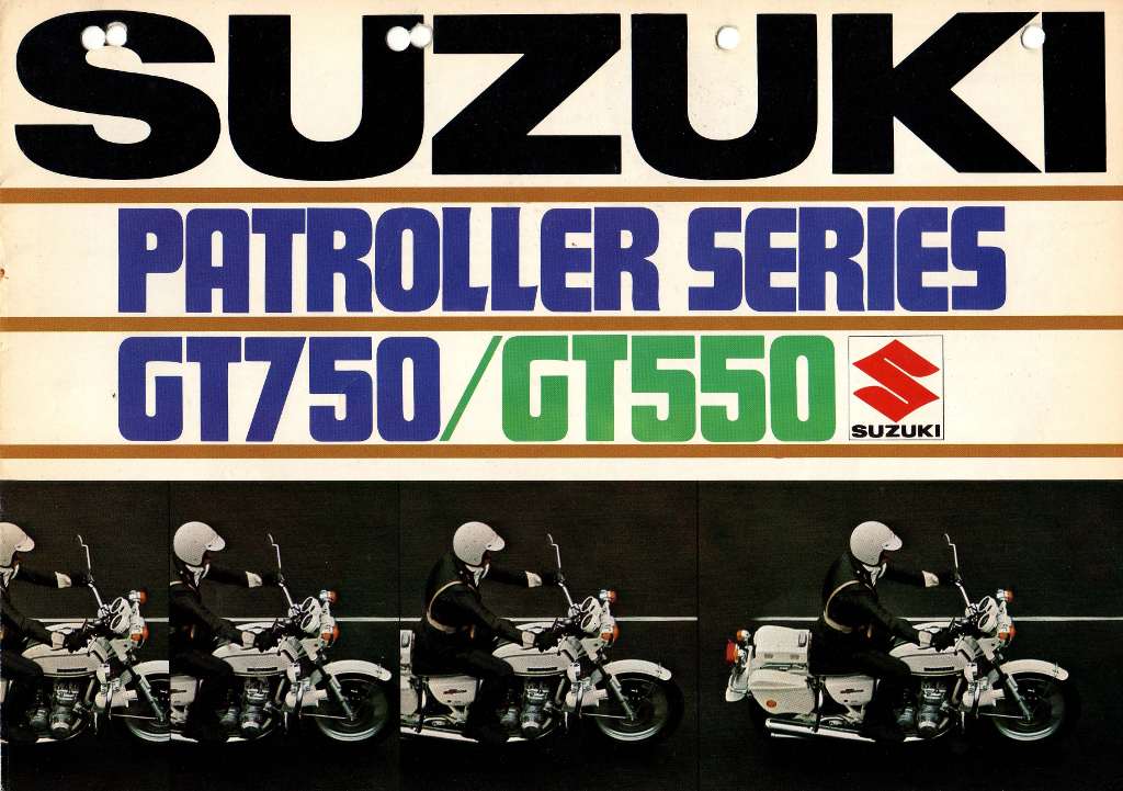 In addition to the GT750 and T500 Patroller or Highway models, police versions based on the GT550 were also offered. This Suzuki sales brochure was scanned by Glenn Reay - just click through to see all six pages: