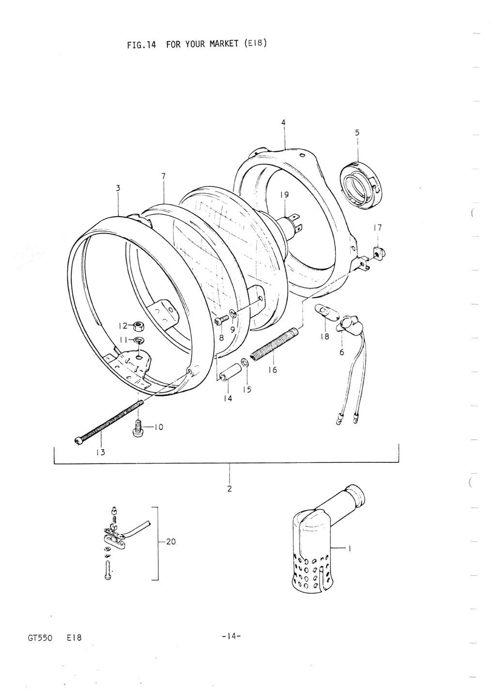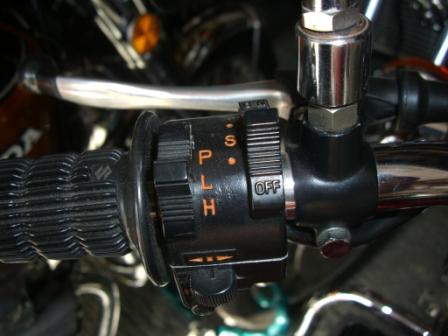 The headlamps included the city driving bulb mounted in the side of the main reflector and the left handlebar had the same spring loaded 'pass' switch (57700-31610) as used on the GT750 and seen in the photo to the right which was supplied by Mick Taylor. This switch was fitted to 'M', 'A' and 'B' models.