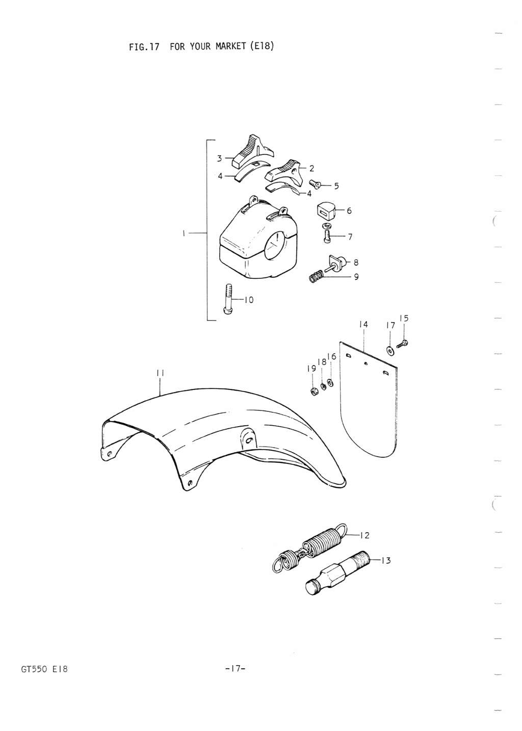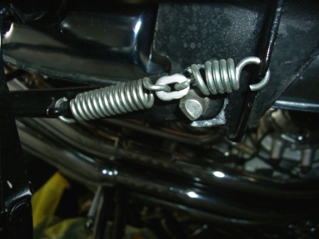 The Swiss model 'A' and 'B' GT550 was one of two variants to include a self retracting prop stand. The E22 'A' model sold in Germany was the other. To the right is a photo sent to me by Mick Taylor looking up at the underside of the prop stand mounting plate of an E18 GT750 'B' which was similarly equipped, with the left side frame rail to the bottom of the photo. In this you can see the special spring (42421-31000) and special bolt (09119-10014) used.