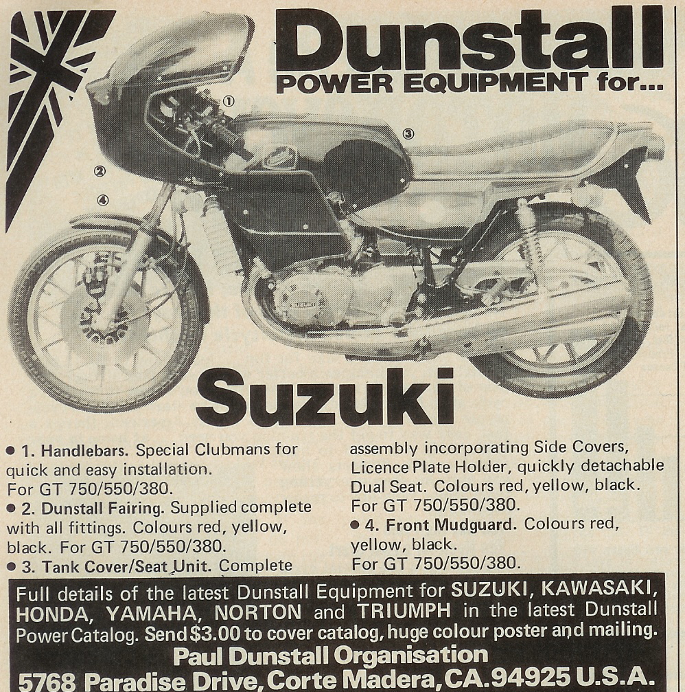 Paul Dunstall first produced one of his seat/fairing combinations for the GT550 in 1975. In 1976 he was offering conversion kits for the GT750, GT550 and the GT380 which included a fibreglass tank cover with blended seat,rear fender, and separate sport front fairing, as well as a handle bar mounted fairing for the GT250. The Heron Suzuki GB line-up shown below was offered in 1976. Production stopped in 1977.
