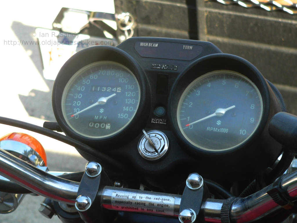The tachometer also had a revision to is face plate and displayed the redline area on the segments in the respective area of the face. The Suzuki 'S' symbol was retained on the faces, centrally located just below the needle boss area.