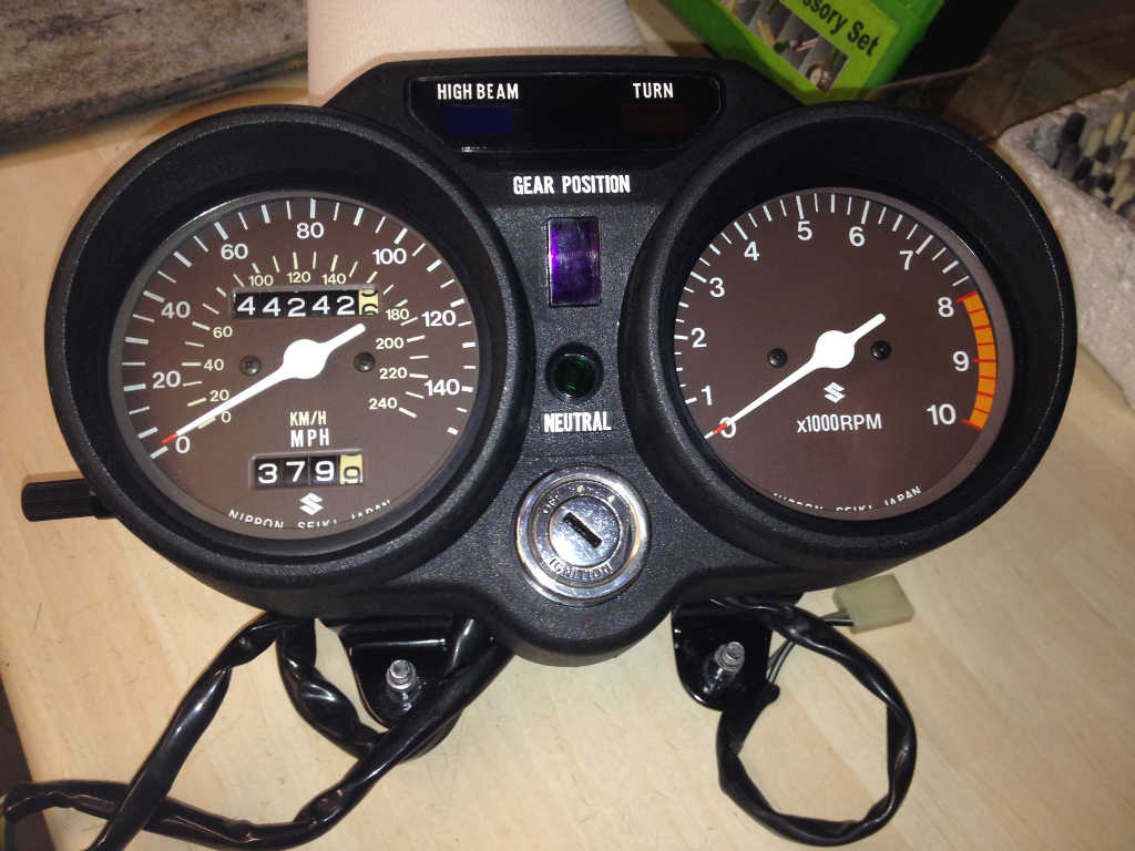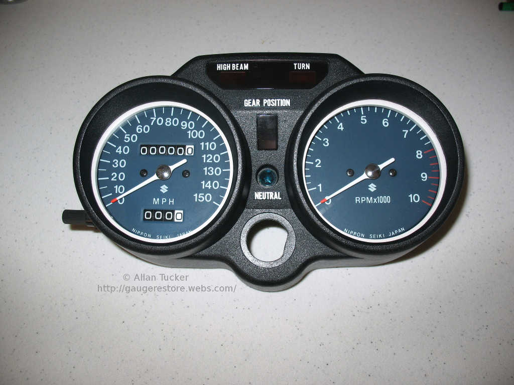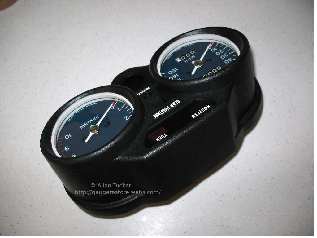 The photos show a set of restored gauges and main case for a 72/73 GT550 in mph scale. This case is missing the rubber surrounds.