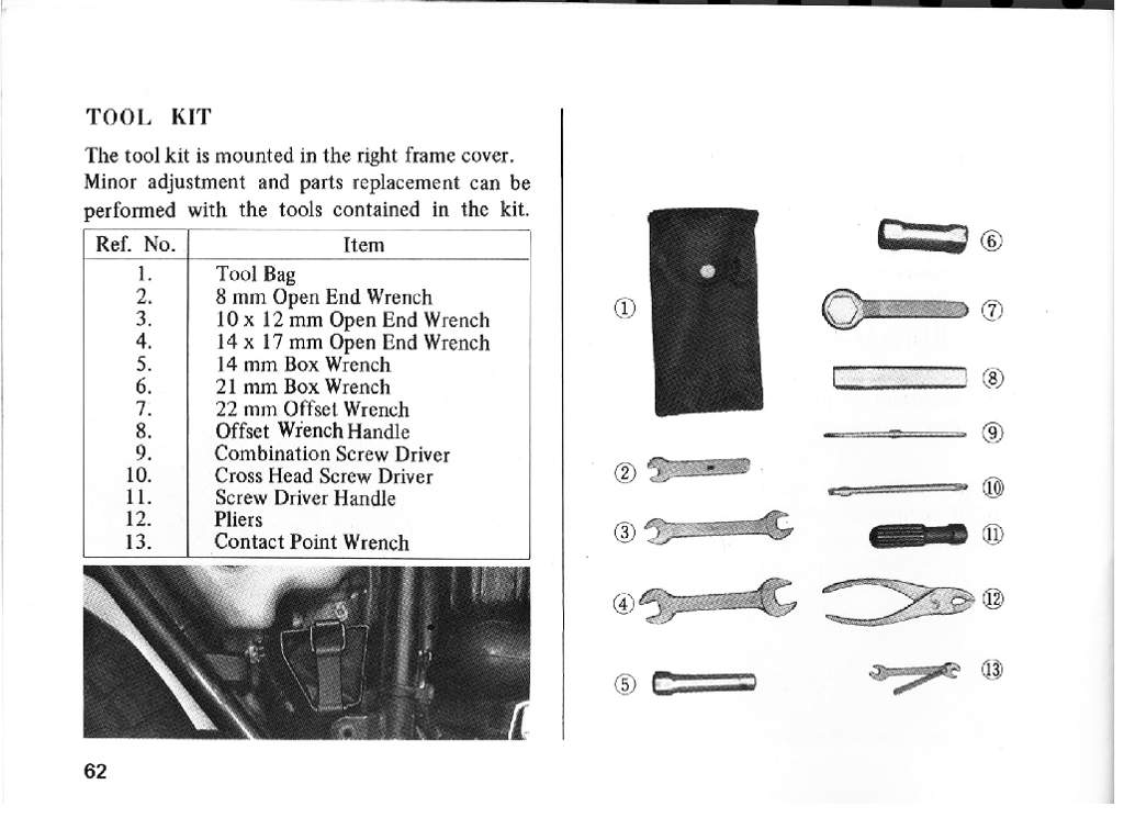 Beginning with the M model, the contact points wrench and gapping tool (09930-20111) were no longer supplied, reducing the kit count to twelve items. The part number for the tool kit itself did not change over the course of production. It is also listed as being the same part number as used on the GT750, but the one offset wrench is a 22 mm rather than being a 24 mm which seems odd.
