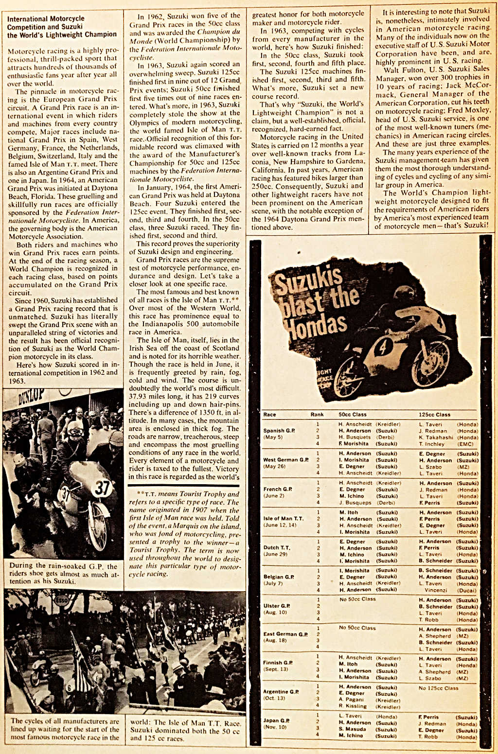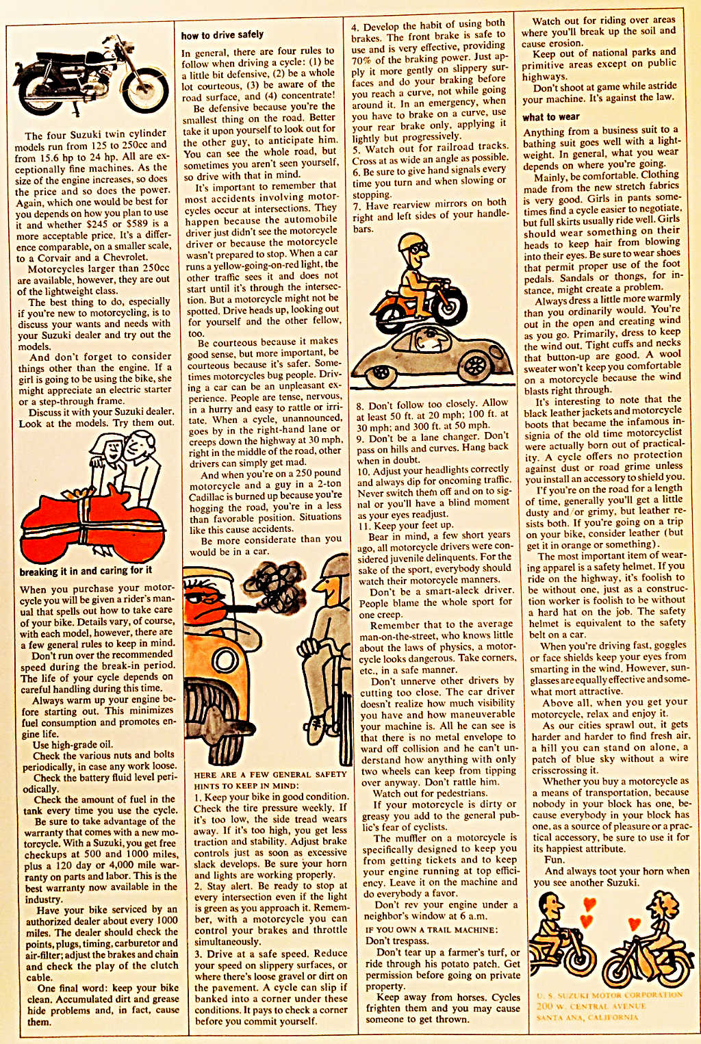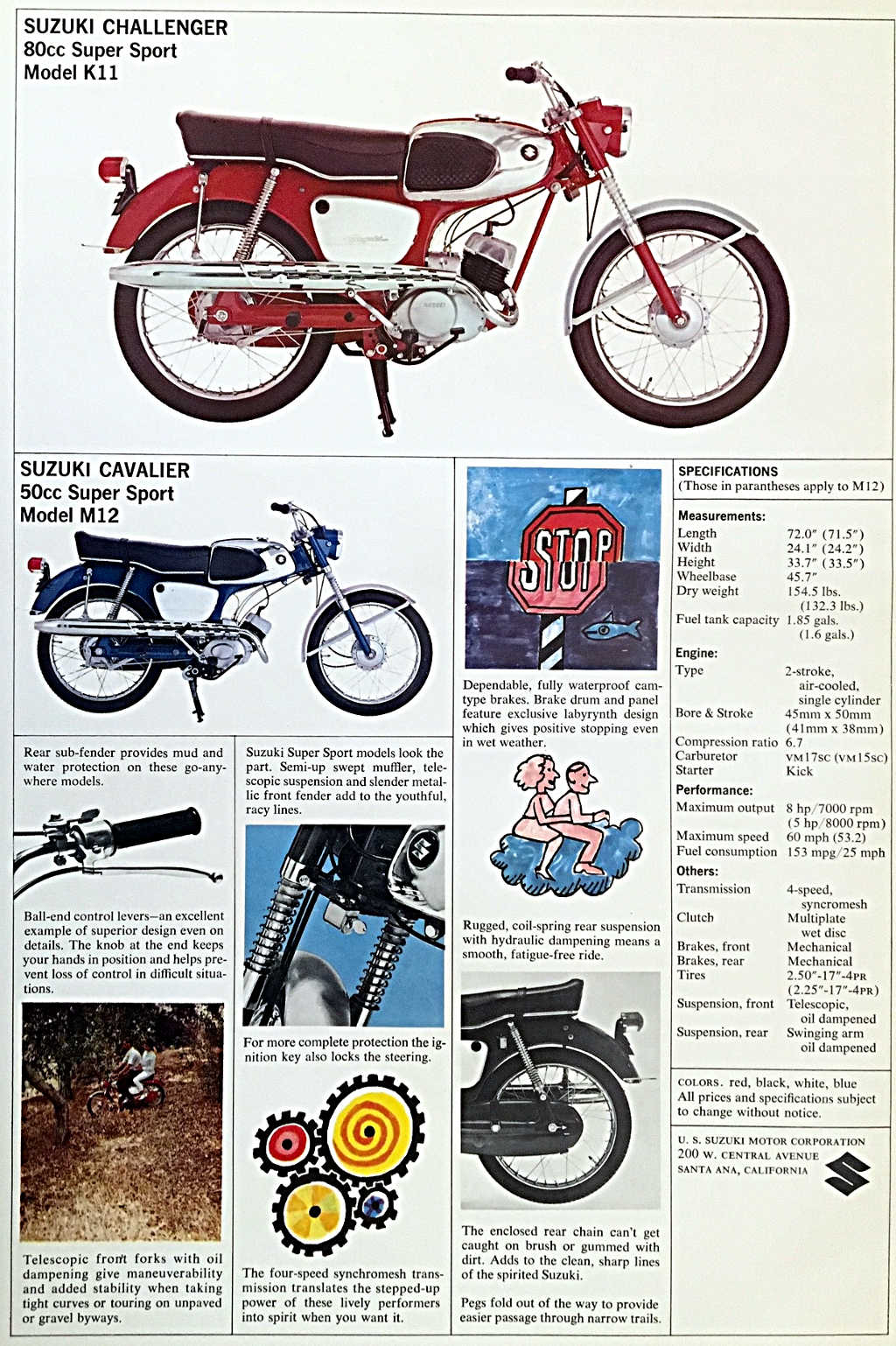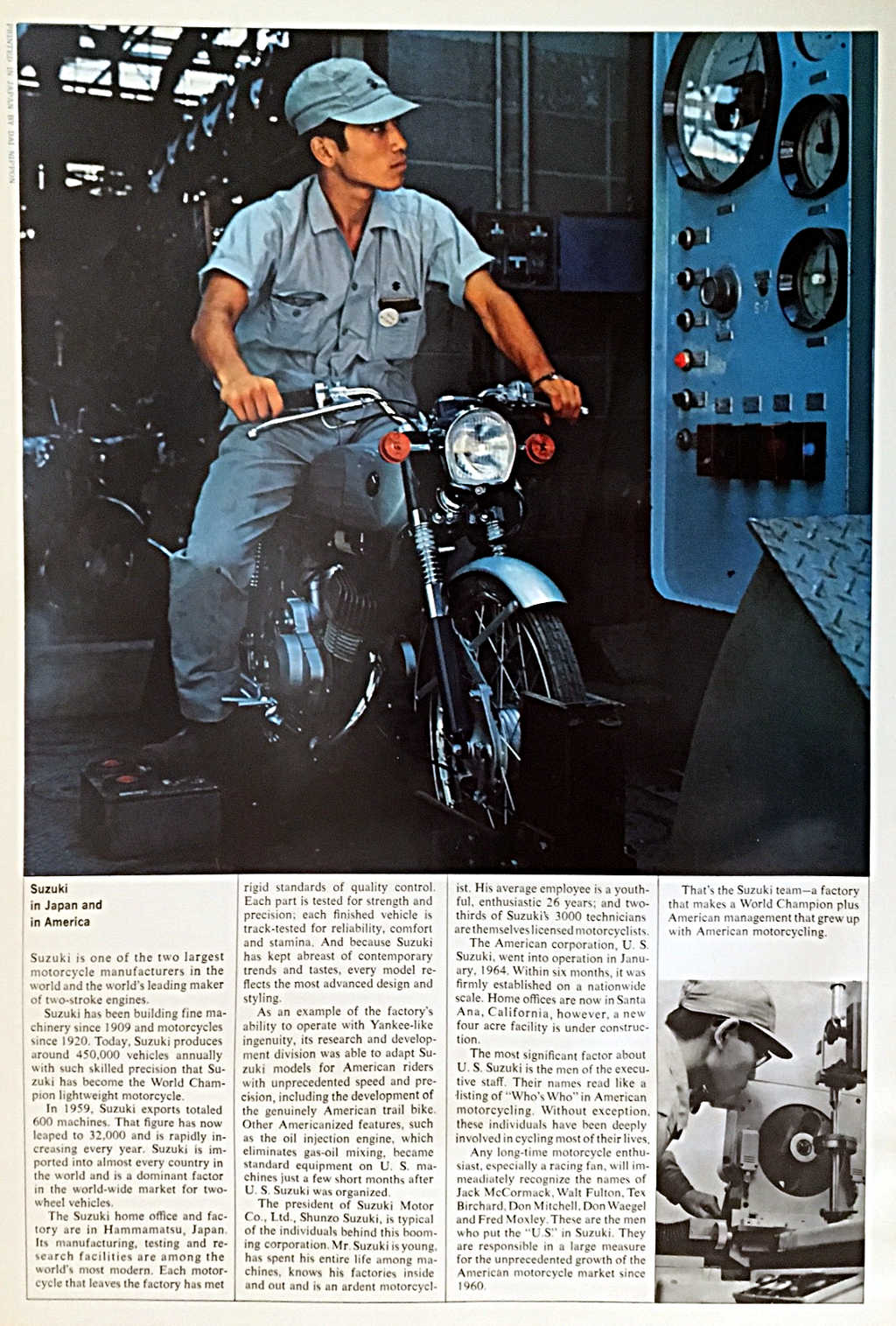 Chip Miller is an ace serial Suzuki restorer in the USA, and he sent me scans of this information package which I suspect was intended for dealers rather than buyers. It appears to be a U.S. Suzuki Motor Corporation publication, rather than one created in Japan. Just 'click' on any image to see a larger version.