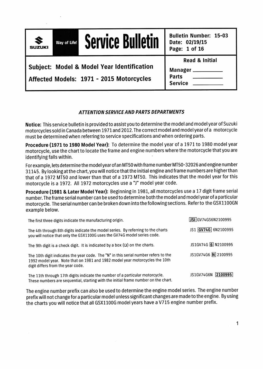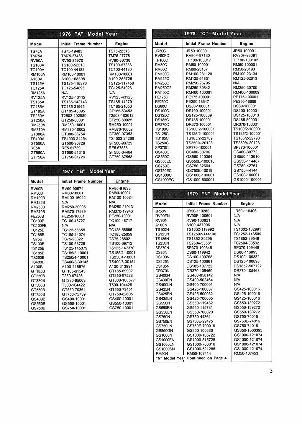 From Suzuki Canada, Service Bulletin 15-03 which is a similar list to Murrey Barnard's ( his is available at at this link ), and also covers machines from 1971 through till 2015. I have only included the first few pages of interest to me here (just click through the photo stack), but I do have the full document and could look up numbers on request. Note that both the Suzuki Canada and Ozebook lists have what appear to be typos.