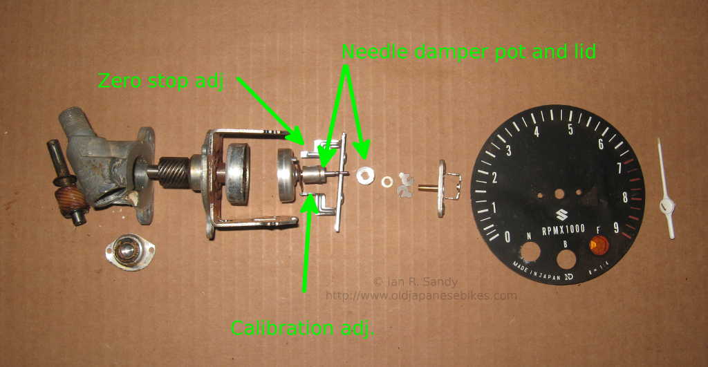 For the 1972 GT750 J model, I had reproduction shells made to replace the cracked plastic ones you normally are faced with on this model. I may have more of the plastic shells made, but I am currently (in 2019) sold out although I do still have a few reset knobs available. I have provided a very high level 'how to' repair guide to just replace the plastic shell which is located at this link. I don't go into detail about adding damper fluid to the dampening pot as this is easily done wrong resulting in a scrapped guage, however for those brave enough to give it a try I have included a couple of photos below showing where those pots are located - tachometer on the left and speedometer on the right below.